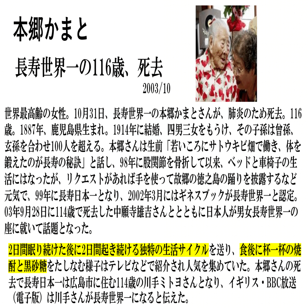 以前の記事で、世界最高齢女性のことを紹介した。二日眠り二日起きる独特の生活リズムで、食後に少量の焼酎と黒砂糖をたしなんだという。健康のために早寝早起きを勧め甘いものと酒の害を説く医者は、この最高齢女性を前にして、苦笑いするしかないだろう。