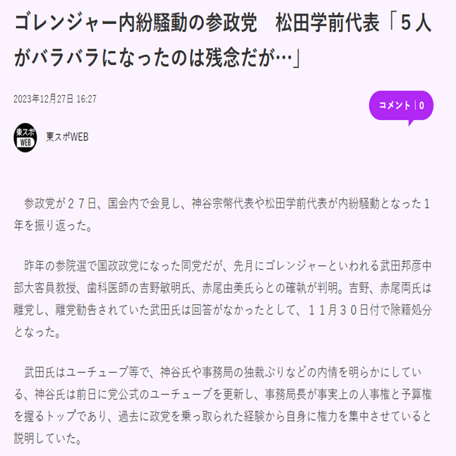2022年参院選で神谷が当選した。しかしその後、内紛が明らかになった。