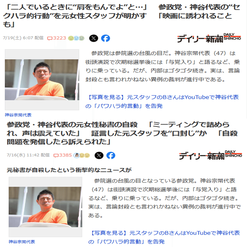 神谷氏については、セクハラだけではなく、不倫相手に子供を産ませたという話もあって、一部メディアが批判している。