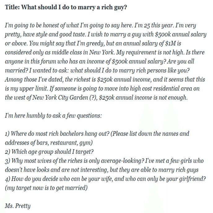 今年25歳の女性です。変に謙遜することなく、あえて率直に言いますが、私は美人です。スタイルもいいですし、内面的にも魅力的だと思っています。結婚するとして、そんな私に見合うのは、最低限年収50万ドル以上の男性だと思っています。