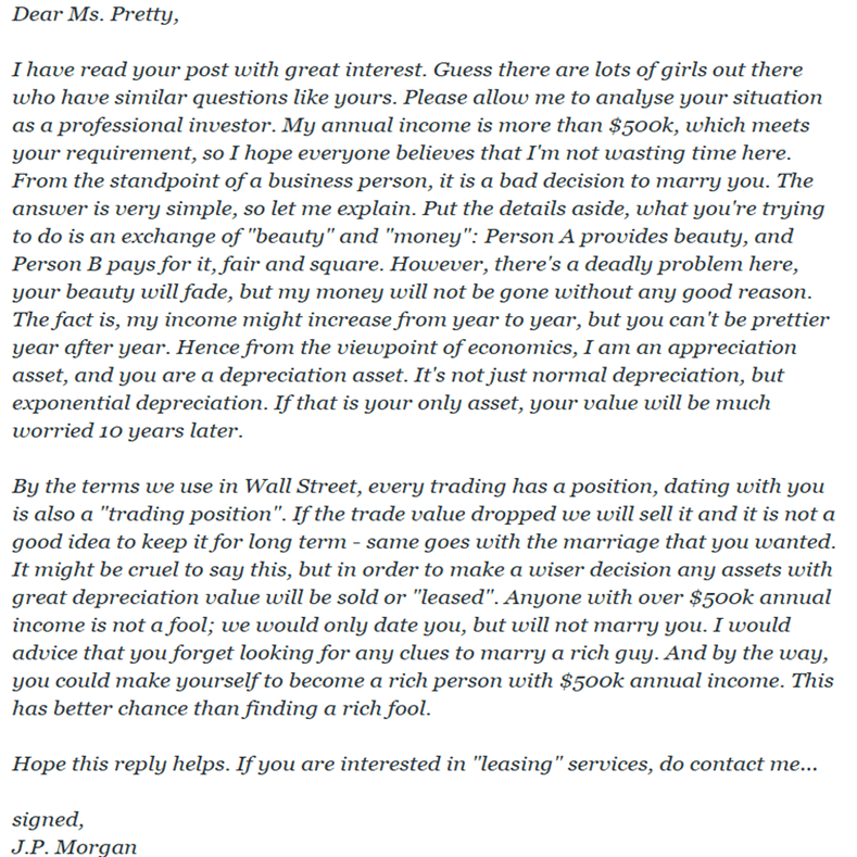 それは、上記JPモルガン氏の返信が、男女関係の真理を突いているからだろう。