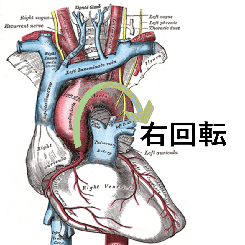 動脈血は左心房から左心室を経て大動脈弓に駆出されるが、ご覧の通り、これは右回転の流れである。