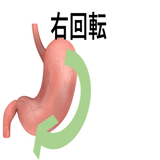 食塊は食道を経て胃に流れ込み十二指腸へと進むが、この流れも右回転である。