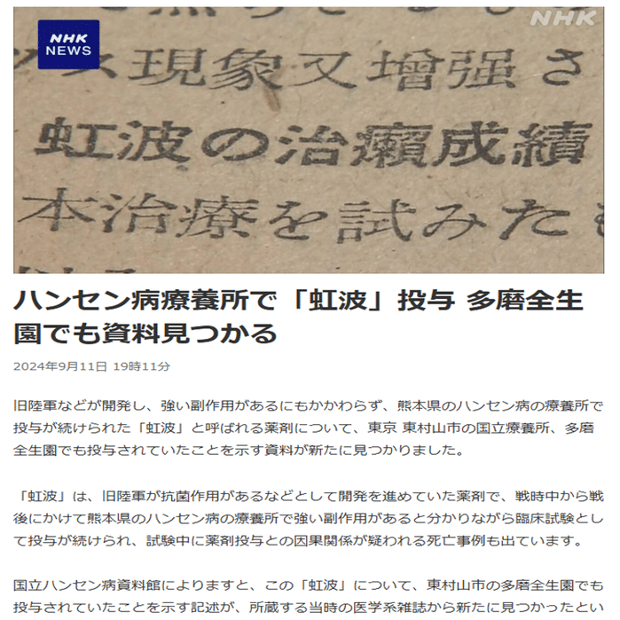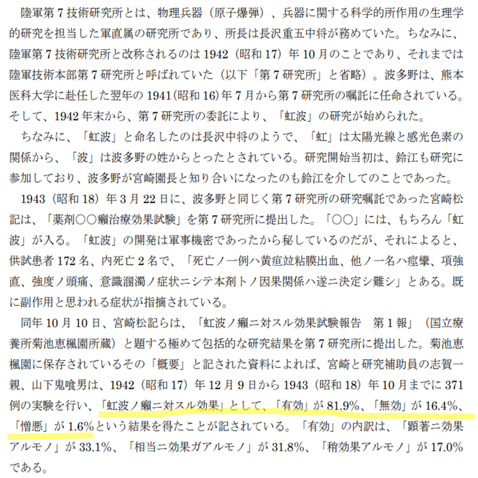 ハンセン病の患者を相手に虹波の有効性を試す人体実験をしていたとして、戦後(ごく最近でも)批判されることが多いけれど、研究資料によると、虹波のハンセン病に対する有効率は8割を超えていた。