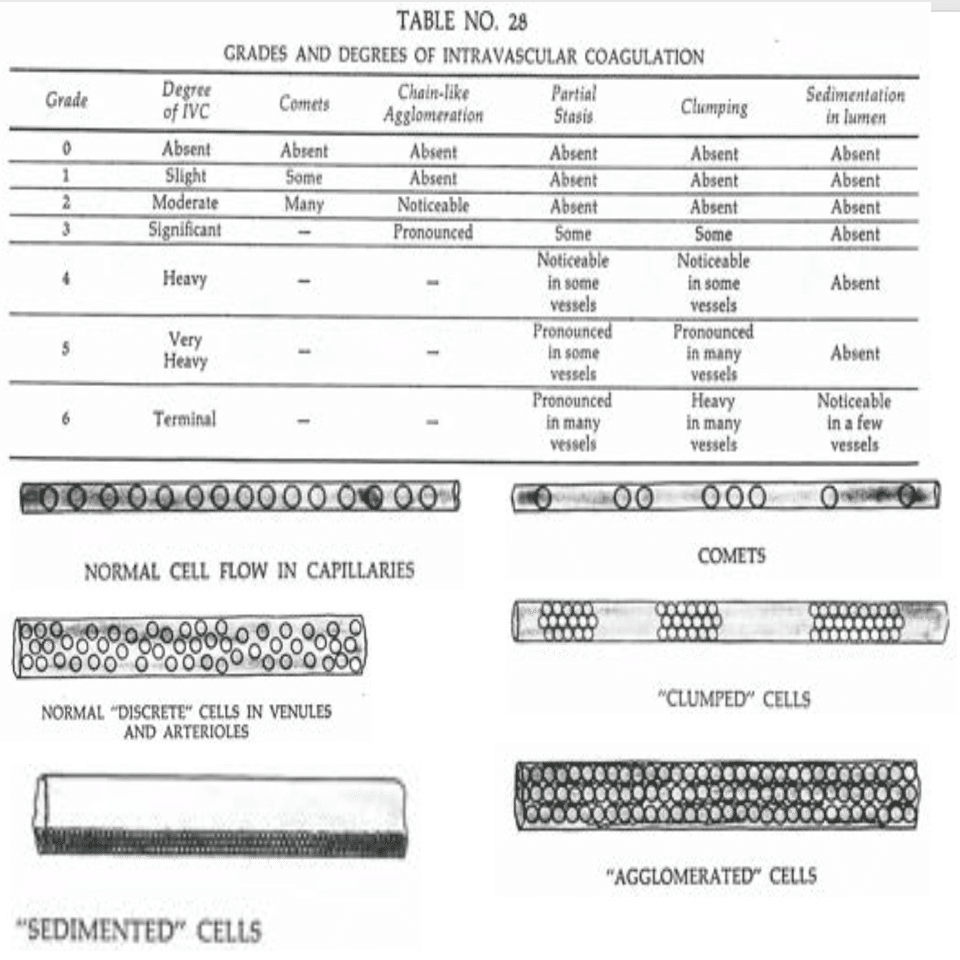 マラリアにかかったサルの血管、たとえば、下大静脈を取り出し、分断面を見ると、下3分の1はマラリアの感染した血球(赤血球、白血球など)の凝集物がベッタリへばりついている。真ん中3分の1は連銭形成したドロドロの血液がゆっくりと流れ、上3分の1は血球成分を含まない血漿がさらさらと流れている。
