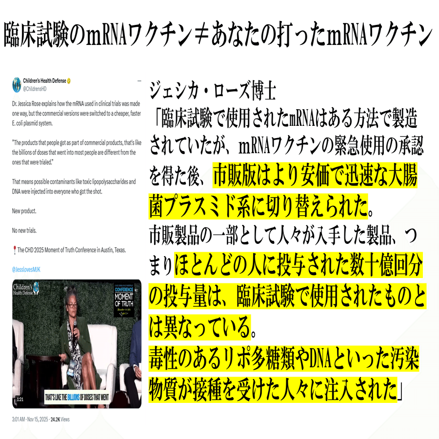 臨床試験で使われたmRNAワクチンと、数十億人の大規模接種で使われたmRNAワクチンは別ものだったという告発も出てきました。
