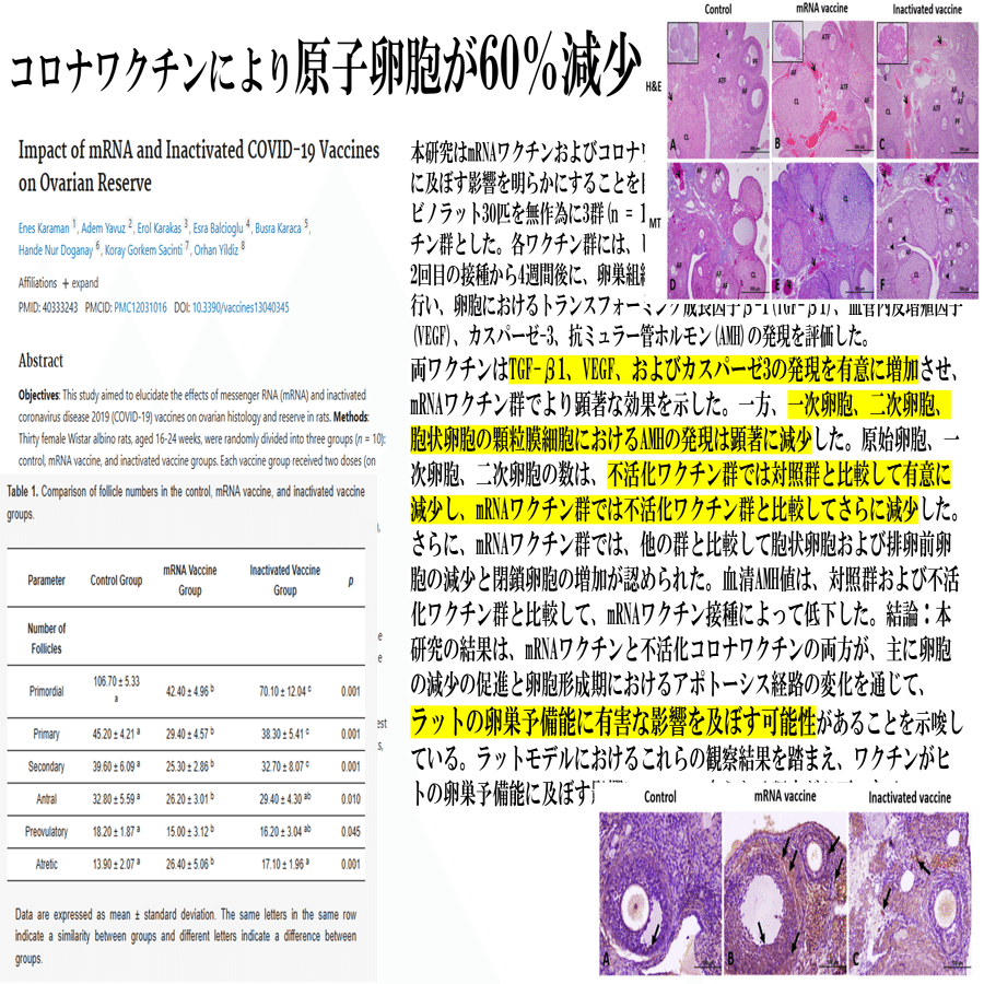 女性は、オギャーと泣いてこの世に生まれた時点で、一生分の卵子を卵巣内に備えて生まれてくるといいます。マウスの研究ですが、mRNAワクチンを打ったメスマウスでは、原子卵胞が60%減少していました。一生分の卵子のうち、60%が失われてしまったということです。