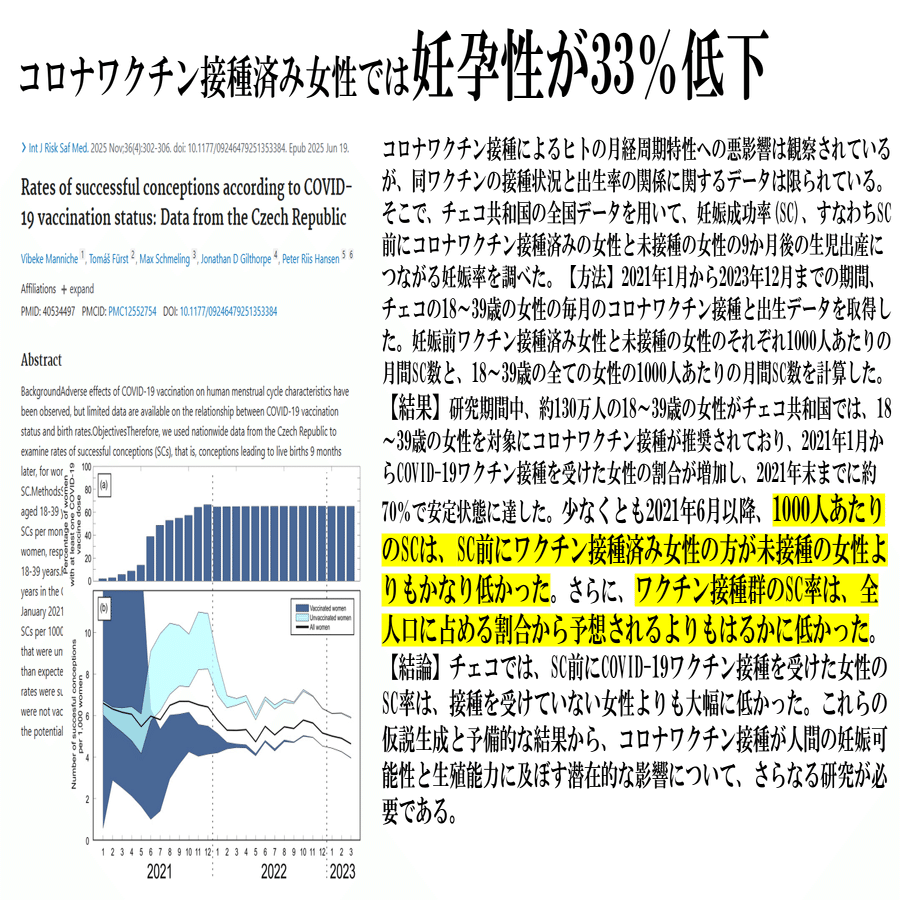 2025年11月に発表された研究で、コロナワクチンを受けた女性では、非接種の女性と比べて、妊孕性が33%低下することが示されました。