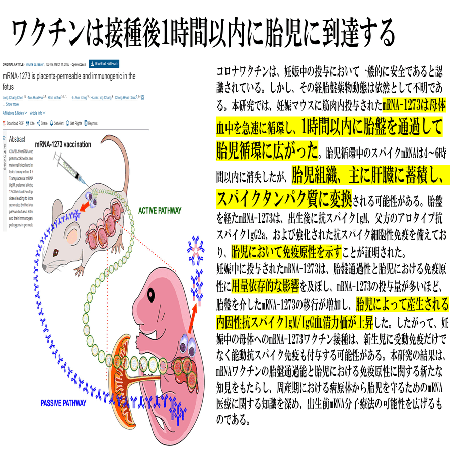 妊婦が打った場合、mRNAは1時間以内に胎盤を通過し、胎児循環に広がります。また、胎児組織に蓄積し、スパイクタンパクに変換される可能性があります。ファイザー社の説明とは全然違う挙動をしています。