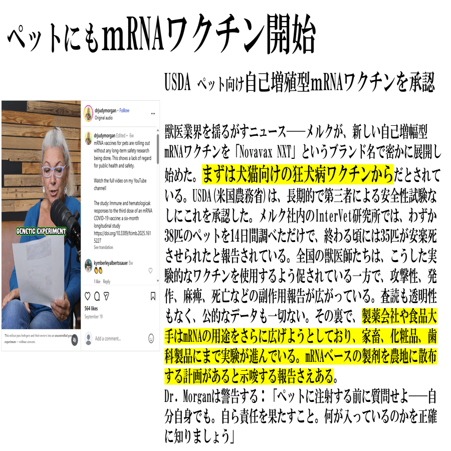 狂犬病ワクチンは義務なので、多くのペットに打たれることになる。さすがにバタバタとペットが死ぬことはないと思うけど、自己増殖型mRNAワクチンなので、シェディングのリスクはかなり大きいと思います。ペットから飼い主に対して、何らかの悪影響があるはずです。
