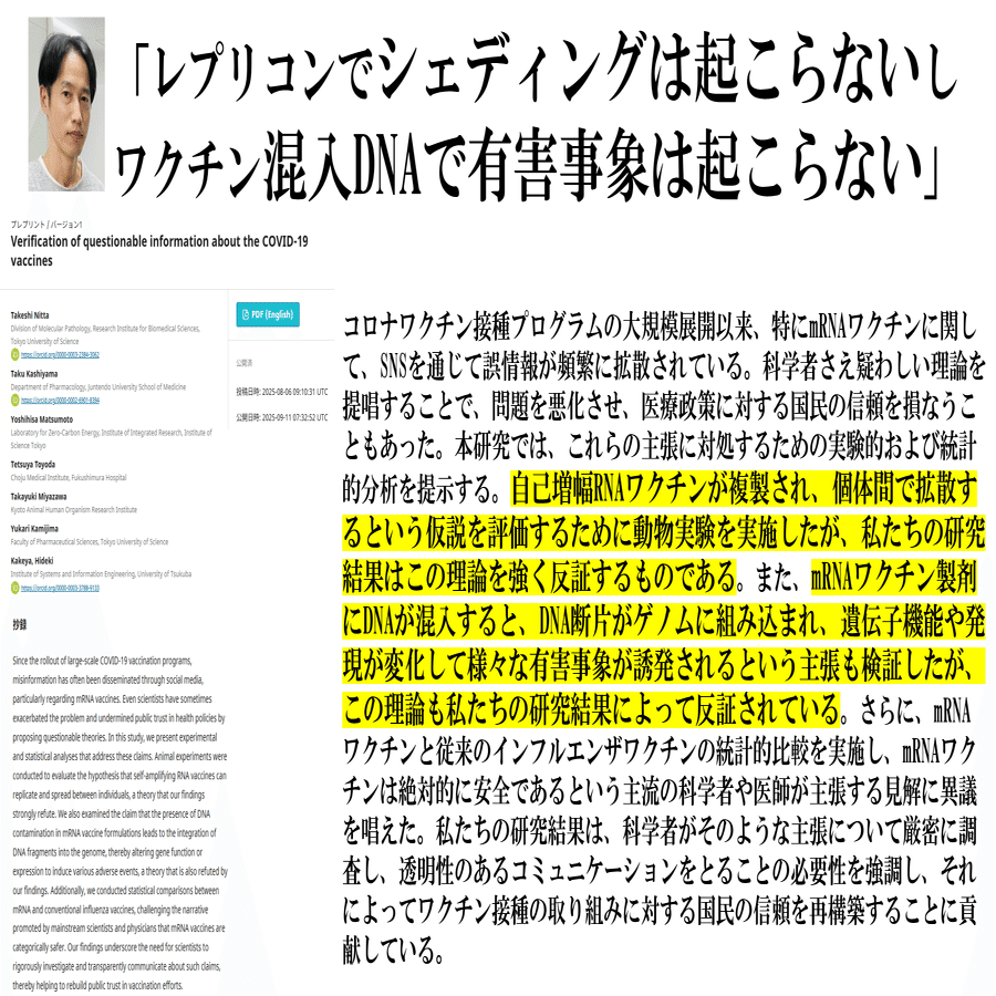 「ワクチンにDNAが混入しているとして、しかし有害事象は起こらないし、自己増殖型mRNAワクチンでシェディングは起こらない」