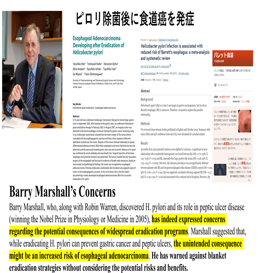 しかし、ノーベル賞受賞後のマーシャルの活動はあまり知られていません。抗生剤によりピロリ除菌すれば確かに胃癌は減少するが、食道癌が増加することに気付いたマーシャルは、安易なピロリ除菌に警鐘を鳴らしました。しかしピロリ除菌に商機を見出した製薬利権がガッツリ食い込んだ後では、当の提唱者本人の声も届きませんでした。