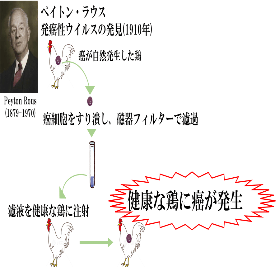 1910年ペイトン・ラウスはこんな実験をしました。鶏に自然発生した癌を取り出し、それをすり潰し、磁器フィルター(0.1~0.5μmの径で、細菌は通らないがウイルスは通過する)で濾過しました。この濾液を健康な鶏に注射したところ、癌を発症した。