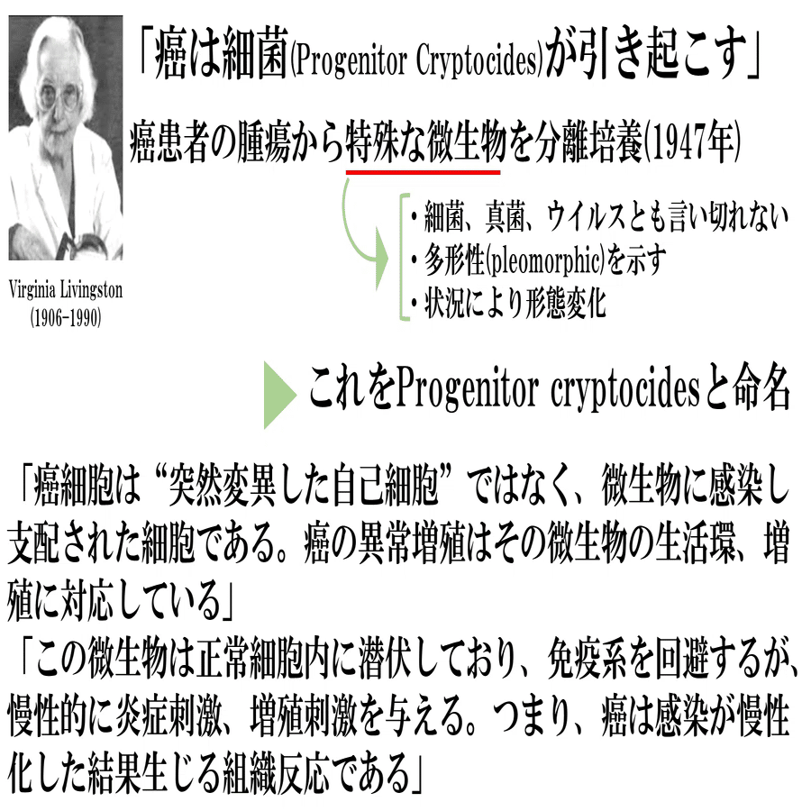 つまり、癌は細菌によって起こり得るし、ウイルスによっても起こり得る。しかし同じような主張でも、「癌はカビにより発症する」と唱えた医者は、医師免許剥奪のうえに裁判で有罪判決を受け、不遇の晩年を過ごしました。製薬会社にとってうま味ゼロの学説だったということでしょう。
