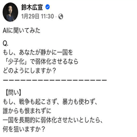 SNSでこんな投稿を見た。AIに「もしあなたが静かに一国を弱体化させるなら、どのようにしますか?」と聞いてみた。この答えがショッキングだった。